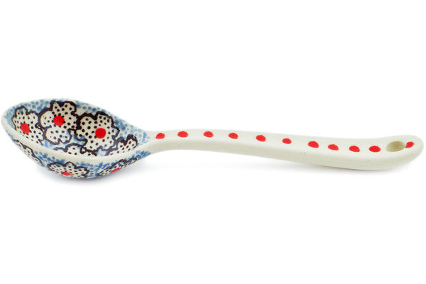 This Black Daisies 6" Spoon was handmade and hand decorated in Boleslawiec, Poland by skilled artisans according to old traditional methods. This is a Polish pottery Signature Unikat, which means that it has been hand painted with both sponges and brushes and it is signed by the artist who painted it. Unikat pieces are the most intricate works of art. Larger Unikat items take hours of very careful work to finish. This Polish stoneware is microwave, dishwasher, freezer, and oven safe up to 480°F. It does not contain lead or cadmium. It is part of the Black Daisies Collection.