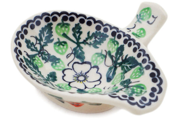 This Strawberries And Cream 4" Spoon Rest was handmade and hand decorated in Boleslawiec, Poland by skilled artisans according to old traditional methods. This is a Polish pottery Signature Unikat, which means that it has been hand painted with both sponges and brushes and it is signed by the artist who painted it. Unikat pieces are the most intricate works of art. Larger Unikat items take hours of very careful work to finish. This Polish stoneware is microwave, dishwasher, freezer, and oven safe up to 480°F. It does not contain lead or cadmium. It is part of the Strawberries And Cream Collection.
