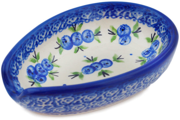 This Blueberry Dreams 5" Spoon Rest was handmade and hand decorated in Boleslawiec, Poland by skilled artisans according to old traditional methods. This Polish stoneware is microwave, dishwasher, freezer, and oven safe up to 480°F. It does not contain lead or cadmium. It is part of the Blueberry Dreams Collection.
