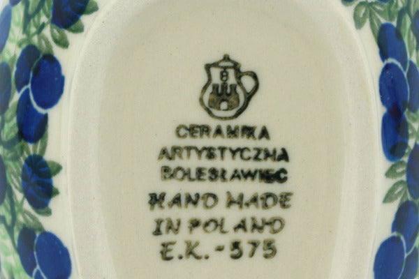 This Blueberry Fields Forever 5" Spoon Rest was handmade and hand decorated in Boleslawiec, Poland by skilled artisans according to old traditional methods. This Polish stoneware is microwave, dishwasher, freezer, and oven safe up to 480°F. It does not contain lead or cadmium. It is part of the Blueberry Fields Forever Collection.