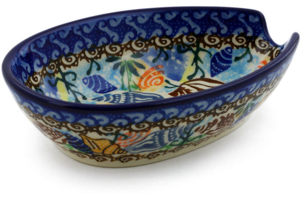 This Ocean Whisper 5" Spoon Rest was handmade and hand decorated in Boleslawiec, Poland by skilled artisans according to old traditional methods. This is a Polish pottery Signature Unikat, which means that it has been hand painted with both sponges and brushes and it is signed by the artist who painted it. Unikat pieces are the most intricate works of art. Larger Unikat items take hours of very careful work to finish. This Polish stoneware is microwave, dishwasher, freezer, and oven safe up to 480°F. It does not contain lead or cadmium. It is part of the Ocean Whisper Collection.