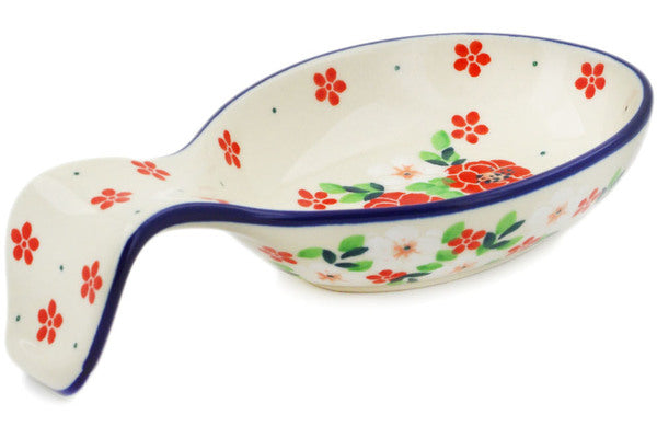 This Rosy Cheeks 7" Spoon Rest was handmade and hand decorated in Boleslawiec, Poland by skilled artisans according to old traditional methods. This Polish stoneware is microwave, dishwasher, freezer, and oven safe up to 480°F. It does not contain lead or cadmium. It is part of the Rosy Cheeks Collection.