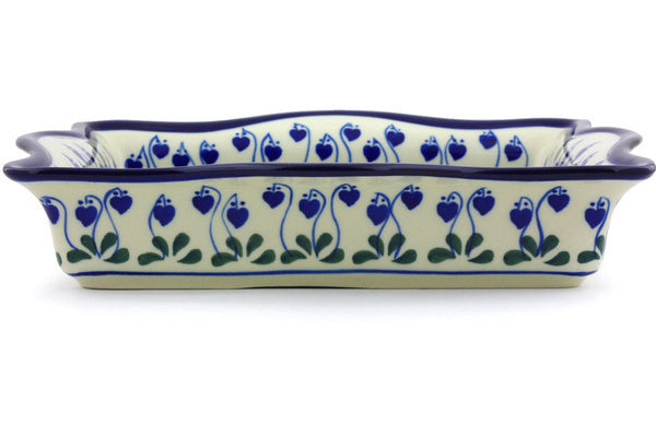This Bleeding Heart Peacock 12" Square Bowl was handmade and hand decorated in Boleslawiec, Poland by skilled artisans according to old traditional methods. This Polish stoneware is microwave, dishwasher, freezer, and oven safe up to 480°F. It does not contain lead or cadmium. It is part of the Bleeding Heart Peacock Collection.