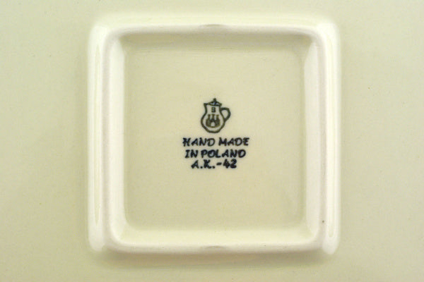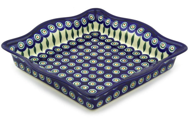 This Peacock Leaves 12" Square Bowl was handmade and hand decorated in Boleslawiec, Poland by skilled artisans according to old traditional methods. This Polish stoneware is microwave, dishwasher, freezer, and oven safe up to 480°F. It does not contain lead or cadmium. It is part of the Peacock Leaves Collection.