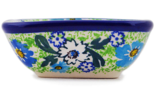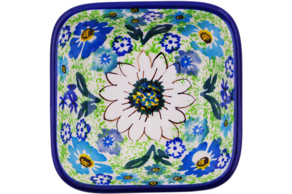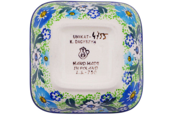 This Daisy Valley 3" Square Bowl was handmade and hand decorated in Boleslawiec, Poland by skilled artisans according to old traditional methods. This is a Polish pottery Signature Unikat, which means that it has been hand painted with both sponges and brushes and it is signed by the artist who painted it. Unikat pieces are the most intricate works of art. Larger Unikat items take hours of very careful work to finish. This Polish stoneware is microwave, dishwasher, freezer, and oven safe up to 480°F. It does not contain lead or cadmium. It is part of the Daisy Valley Collection.