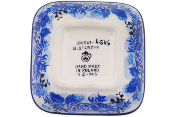 This Frosted Bouquet 3" Square Bowl was handmade and hand decorated in Boleslawiec, Poland by skilled artisans according to old traditional methods. This is a Polish pottery Signature Unikat, which means that it has been hand painted with both sponges and brushes and it is signed by the artist who painted it. Unikat pieces are the most intricate works of art. Larger Unikat items take hours of very careful work to finish. This Polish stoneware is microwave, dishwasher, freezer, and oven safe up to 480°F. It does not contain lead or cadmium. It is part of the Frosted Bouquet Collection.