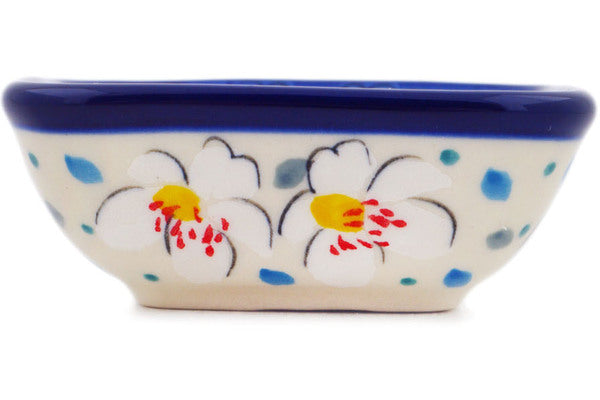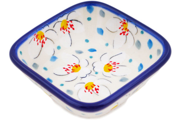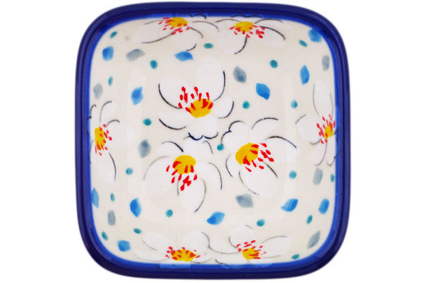 This Heavenly 3" Square Bowl was handmade and hand decorated in Boleslawiec, Poland by skilled artisans according to old traditional methods. This is a Polish pottery Signature Unikat, which means that it has been hand painted with both sponges and brushes and it is signed by the artist who painted it. Unikat pieces are the most intricate works of art. Larger Unikat items take hours of very careful work to finish. This Polish stoneware is microwave, dishwasher, freezer, and oven safe up to 480°F. It does not contain lead or cadmium. It is part of the Heavenly Collection.
