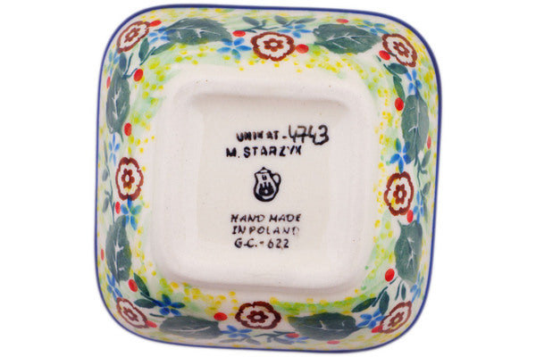 This Yellow Garden 3" Square Bowl was handmade and hand decorated in Boleslawiec, Poland by skilled artisans according to old traditional methods. This is a Polish pottery Signature Unikat, which means that it has been hand painted with both sponges and brushes and it is signed by the artist who painted it. Unikat pieces are the most intricate works of art. Larger Unikat items take hours of very careful work to finish. This Polish stoneware is microwave, dishwasher, freezer, and oven safe up to 480°F. It does not contain lead or cadmium. It is part of the Yellow Garden Collection.