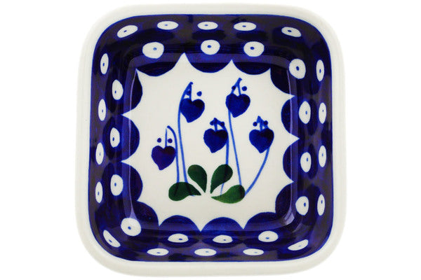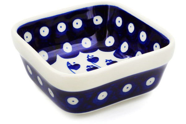 This Bleeding Heart Peacock 4" Square Bowl was handmade and hand decorated in Boleslawiec, Poland by skilled artisans according to old traditional methods. This Polish stoneware is microwave, dishwasher, freezer, and oven safe up to 480°F. It does not contain lead or cadmium. It is part of the Bleeding Heart Peacock Collection.