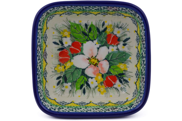 This Country Boutique 4" Square Bowl was handmade and hand decorated in Boleslawiec, Poland by skilled artisans according to old traditional methods. This is a Polish pottery Signature Unikat, which means that it has been hand painted with both sponges and brushes and it is signed by the artist who painted it. Unikat pieces are the most intricate works of art. Larger Unikat items take hours of very careful work to finish. This Polish stoneware is microwave, dishwasher, freezer, and oven safe up to 480°F. It does not contain lead or cadmium. It is part of the Country Boutique Collection.