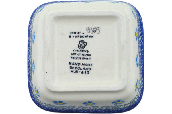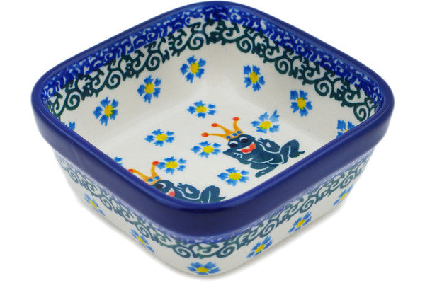 This Frog Prince 4" Square Bowl was handmade and hand decorated in Boleslawiec, Poland by skilled artisans according to old traditional methods. This Polish stoneware is microwave, dishwasher, freezer, and oven safe up to 480°F. It does not contain lead or cadmium. It is part of the Frog Prince Collection.