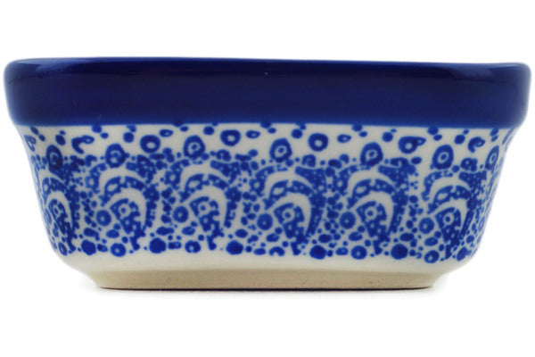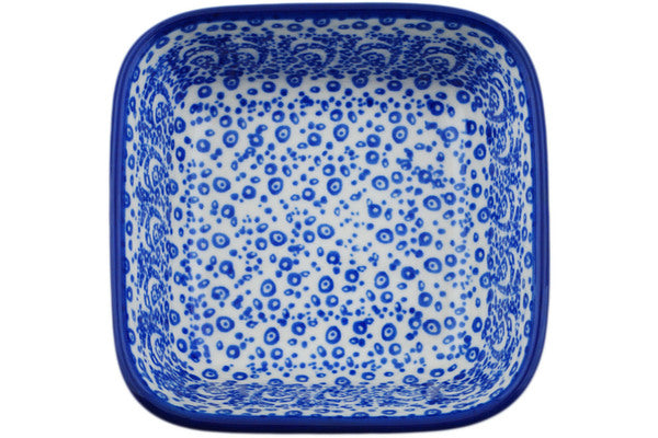 This Raindrops 4" Square Bowl was handmade and hand decorated in Boleslawiec, Poland by skilled artisans according to old traditional methods. This is a Polish pottery Signature Unikat, which means that it has been hand painted with both sponges and brushes and it is signed by the artist who painted it. Unikat pieces are the most intricate works of art. Larger Unikat items take hours of very careful work to finish. This Polish stoneware is microwave, dishwasher, freezer, and oven safe up to 480°F. It does not contain lead or cadmium. It is part of the Raindrops Collection.