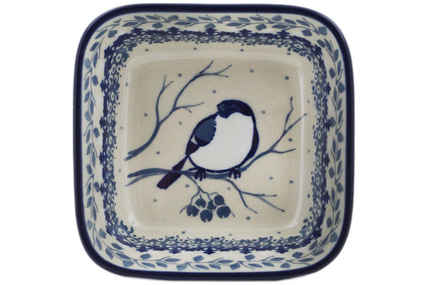 This Waiting Birds 4" Square Bowl was handmade and hand decorated in Boleslawiec, Poland by skilled artisans according to old traditional methods. This is a Polish pottery Signature Unikat, which means that it has been hand painted with both sponges and brushes and it is signed by the artist who painted it. Unikat pieces are the most intricate works of art. Larger Unikat items take hours of very careful work to finish. This Polish stoneware is microwave, dishwasher, freezer, and oven safe up to 480°F. It does not contain lead or cadmium. It is part of the Waiting Birds Collection.