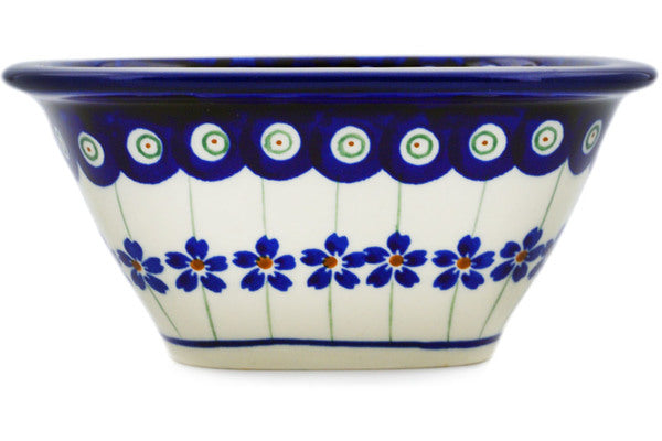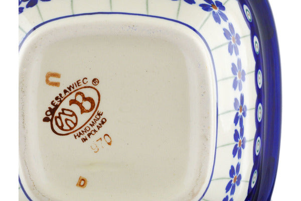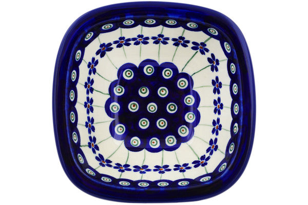 This Flowering Peacock 5" Square Bowl was handmade and hand decorated in Boleslawiec, Poland by skilled artisans according to old traditional methods. This Polish stoneware is microwave, dishwasher, freezer, and oven safe up to 480°F. It does not contain lead or cadmium. It is part of the Flowering Peacock Collection.
