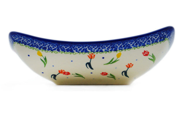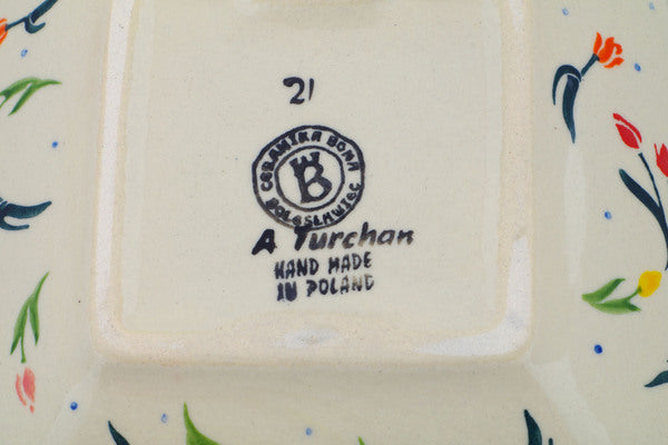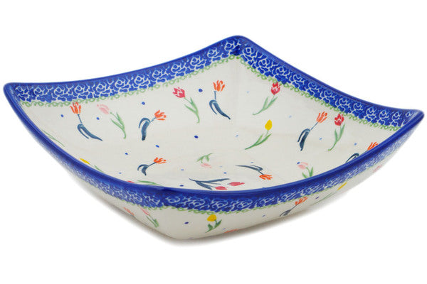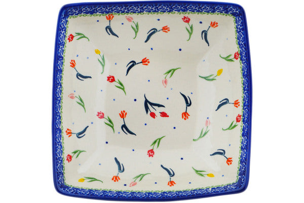 This Tulip Meadow 8" Square Bowl was handmade and hand decorated in Boleslawiec, Poland by skilled artisans according to old traditional methods. This Polish stoneware is microwave, dishwasher, freezer, and oven safe up to 480°F. It does not contain lead or cadmium. It is part of the Tulip Meadow Collection.