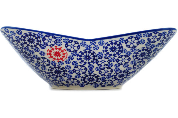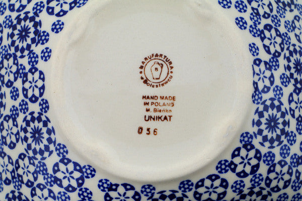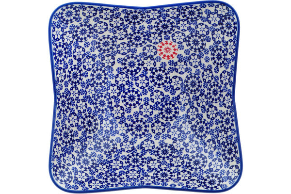This Bullseye 9" Square Bowl was handmade and hand decorated in Boleslawiec, Poland by skilled artisans according to old traditional methods. This is a Polish pottery Signature Unikat, which means that it has been hand painted with both sponges and brushes and it is signed by the artist who painted it. Unikat pieces are the most intricate works of art. Larger Unikat items take hours of very careful work to finish. This Polish stoneware is microwave, dishwasher, freezer, and oven safe up to 480°F. It does not contain lead or cadmium. It is part of the Bullseye Collection.