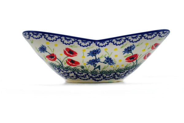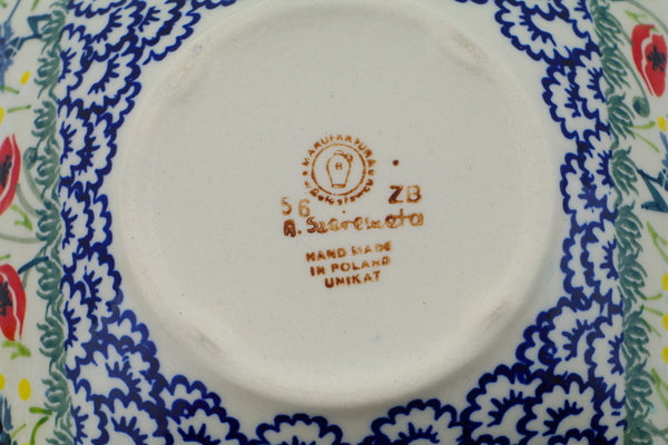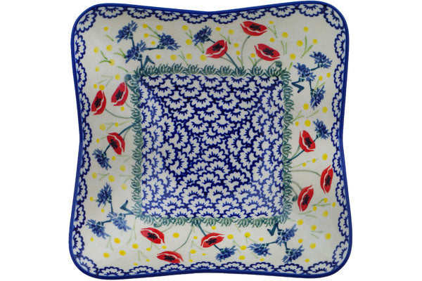This Poppies and Cornflowers 9" Square Bowl was handmade and hand decorated in Boleslawiec, Poland by skilled artisans according to old traditional methods. This is a Polish pottery Signature Unikat, which means that it has been hand painted with both sponges and brushes and it is signed by the artist who painted it. Unikat pieces are the most intricate works of art. Larger Unikat items take hours of very careful work to finish. This Polish stoneware is microwave, dishwasher, freezer, and oven safe up to 480°F. It does not contain lead or cadmium. It is part of the Poppies and Cornflowers Collection.