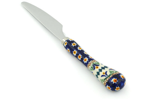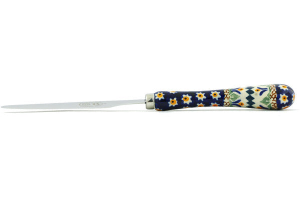 This Floral Peacock 8" Stainless Steel Knife was handmade and hand decorated in Boleslawiec, Poland by skilled artisans according to old traditional methods. This is a Polish pottery Signature Unikat, which means that it has been hand painted with both sponges and brushes and it is signed by the artist who painted it. Unikat pieces are the most intricate works of art. Larger Unikat items take hours of very careful work to finish. This Polish stoneware is microwave, dishwasher, freezer, and oven safe up to 480°F. It does not contain lead or cadmium. It is part of the Floral Peacock Collection.