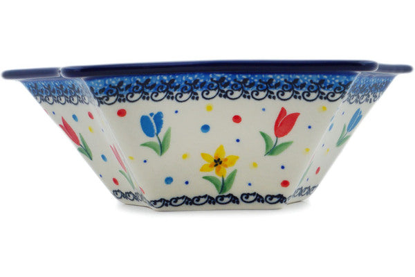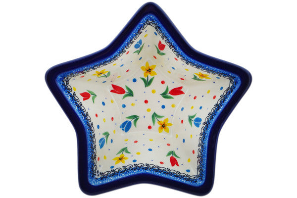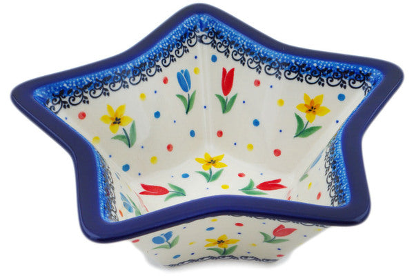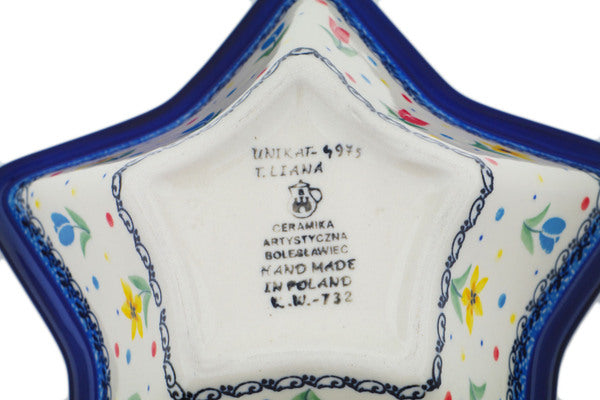 This Full Bloom 8" Star Shaped Bowl was handmade and hand decorated in Boleslawiec, Poland by skilled artisans according to old traditional methods. This is a Polish pottery Signature Unikat, which means that it has been hand painted with both sponges and brushes and it is signed by the artist who painted it. Unikat pieces are the most intricate works of art. Larger Unikat items take hours of very careful work to finish. This Polish stoneware is microwave, dishwasher, freezer, and oven safe up to 480°F. It does not contain lead or cadmium. It is part of the Full Bloom Collection.