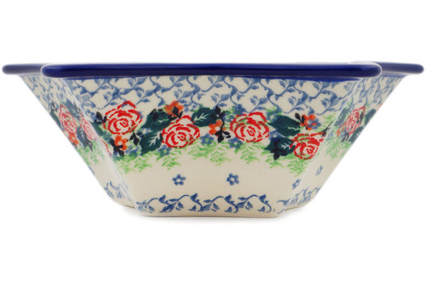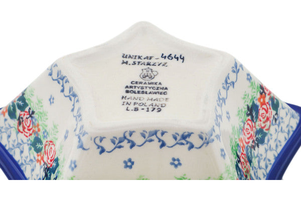 This Rose Wreath 8" Star Shaped Bowl was handmade and hand decorated in Boleslawiec, Poland by skilled artisans according to old traditional methods. This is a Polish pottery Signature Unikat, which means that it has been hand painted with both sponges and brushes and it is signed by the artist who painted it. Unikat pieces are the most intricate works of art. Larger Unikat items take hours of very careful work to finish. This Polish stoneware is microwave, dishwasher, freezer, and oven safe up to 480°F. It does not contain lead or cadmium. It is part of the Rose Wreath Collection.