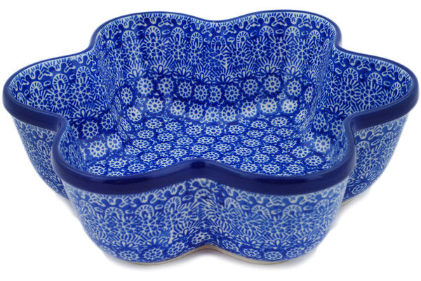 This Winter Frost 9" Star Shaped Bowl was handmade and hand decorated in Boleslawiec, Poland by skilled artisans according to old traditional methods. This Polish stoneware is microwave, dishwasher, freezer, and oven safe up to 480°F. It does not contain lead or cadmium. It is part of the Winter Frost Collection.