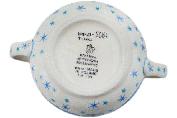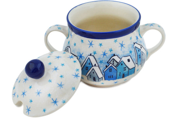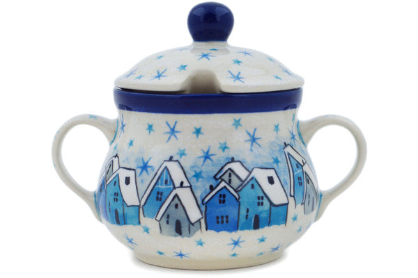 This Snowy Village 7 oz Sugar Bowl was handmade and hand decorated in Boleslawiec, Poland by skilled artisans according to old traditional methods. This is a Polish pottery Signature Unikat, which means that it has been hand painted with both sponges and brushes and it is signed by the artist who painted it. Unikat pieces are the most intricate works of art. Larger Unikat items take hours of very careful work to finish. This Polish stoneware is microwave, dishwasher, freezer, and oven safe up to 480°F. It does not contain lead or cadmium. It is part of the Snowy Village Collection.