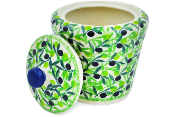 This Olive Grove 9 oz Sugar Bowl was handmade and hand decorated in Boleslawiec, Poland by skilled artisans according to old traditional methods. This is a Polish pottery Signature Unikat, which means that it has been hand painted with both sponges and brushes and it is signed by the artist who painted it. Unikat pieces are the most intricate works of art. Larger Unikat items take hours of very careful work to finish. This Polish stoneware is microwave, dishwasher, freezer, and oven safe up to 480°F. It does not contain lead or cadmium. It is part of the Olive Grove Collection.