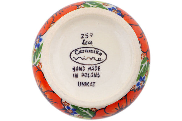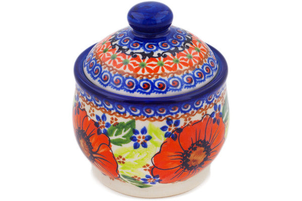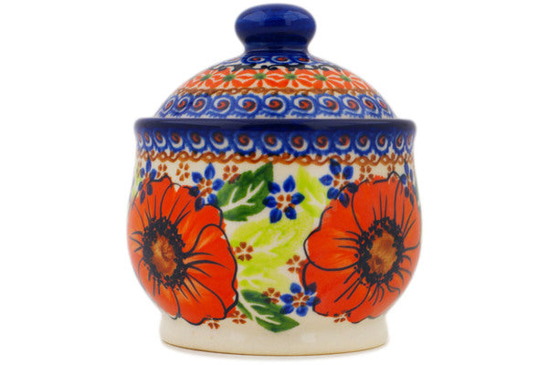 This Orange Zinnia 9 oz Sugar Bowl was handmade and hand decorated in Boleslawiec, Poland by skilled artisans according to old traditional methods. This is a Polish pottery Signature Unikat, which means that it has been hand painted with both sponges and brushes and it is signed by the artist who painted it. Unikat pieces are the most intricate works of art. Larger Unikat items take hours of very careful work to finish. This Polish stoneware is microwave, dishwasher, freezer, and oven safe up to 480°F. It does not contain lead or cadmium. It is part of the Orange Zinnia Collection.