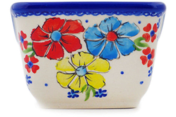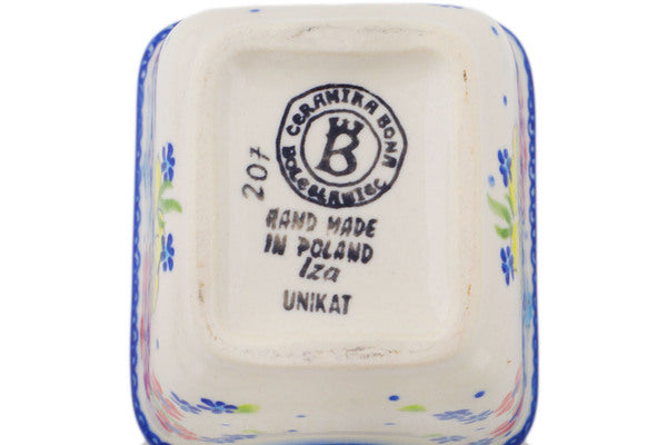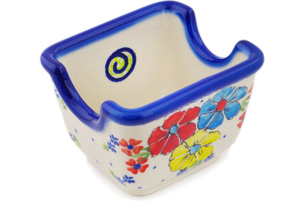 This Country Three 3" Sugar Packet Holder was handmade and hand decorated in Boleslawiec, Poland by skilled artisans according to old traditional methods. This is a Polish pottery Signature Unikat, which means that it has been hand painted with both sponges and brushes and it is signed by the artist who painted it. Unikat pieces are the most intricate works of art. Larger Unikat items take hours of very careful work to finish. This Polish stoneware is microwave, dishwasher, freezer, and oven safe up to 480°F. It does not contain lead or cadmium. It is part of the Country Three Collection.