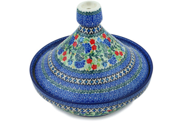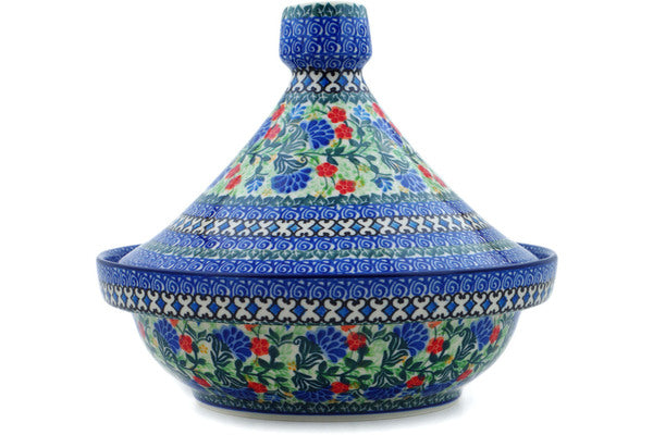This Blue Bonnets 57 oz Tagine Pot was handmade and hand decorated in Boleslawiec, Poland by skilled artisans according to old traditional methods. This is a Polish pottery Signature Unikat, which means that it has been hand painted with both sponges and brushes and it is signed by the artist who painted it. Unikat pieces are the most intricate works of art. Larger Unikat items take hours of very careful work to finish. This Polish stoneware is microwave, dishwasher, freezer, and oven safe up to 480°F. It does not contain lead or cadmium. It is part of the Blue Bonnets Collection.