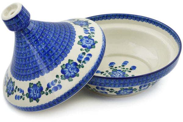 This Blue Poppies 57 oz Tagine Pot was handmade and hand decorated in Boleslawiec, Poland by skilled artisans according to old traditional methods. This Polish stoneware is microwave, dishwasher, freezer, and oven safe up to 480°F. It does not contain lead or cadmium. It is part of the Blue Poppies Collection.