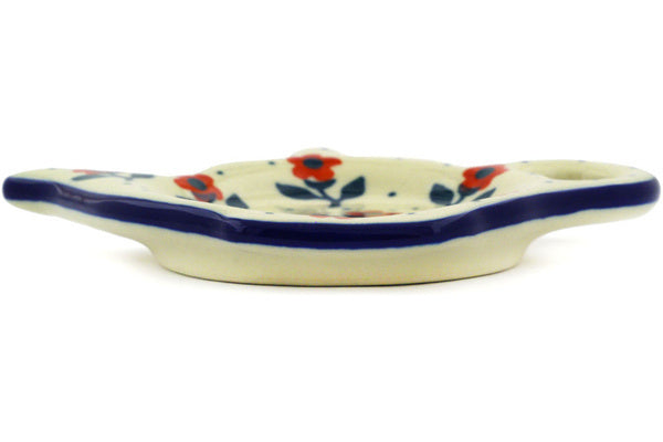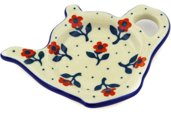 This Auntie Em Scarlet 5" Tea Bag or Lemon Plate was handmade and hand decorated in Boleslawiec, Poland by skilled artisans according to old traditional methods. This Polish stoneware is microwave, dishwasher, freezer, and oven safe up to 480°F. It does not contain lead or cadmium. It is part of the Auntie Em Scarlet Collection.