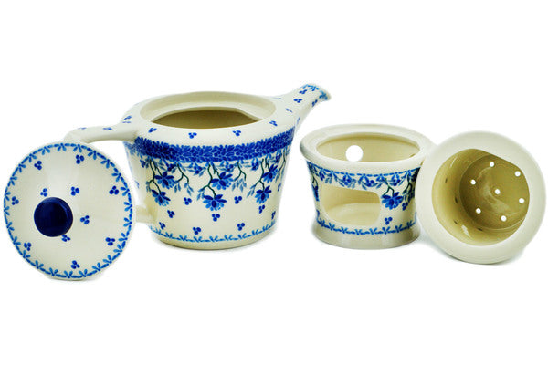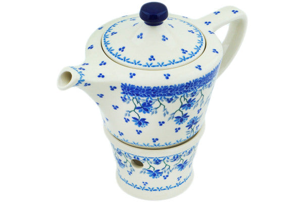 This Blue Grapevine 14 oz Tea or Coffee Pot with Heater was handmade and hand decorated in Boleslawiec, Poland by skilled artisans according to old traditional methods. This Polish stoneware is microwave, dishwasher, freezer, and oven safe up to 480°F. It does not contain lead or cadmium. It is part of the Blue Grapevine Collection.