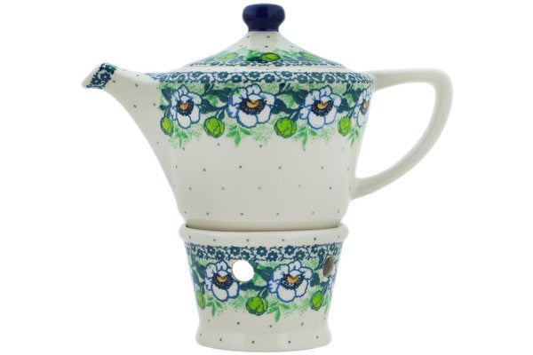 This Green Flora 14 oz Tea or Coffee Pot with Heater was handmade and hand decorated in Boleslawiec, Poland by skilled artisans according to old traditional methods. This Polish stoneware is microwave, dishwasher, freezer, and oven safe up to 480°F. It does not contain lead or cadmium. It is part of the Green Flora Collection.