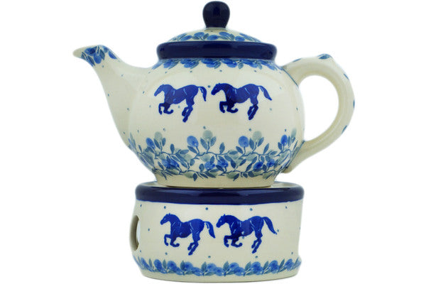 This Horse Gallop 15 oz Tea or Coffee Pot with Heater was handmade and hand decorated in Boleslawiec, Poland by skilled artisans according to old traditional methods. This Polish stoneware is microwave, dishwasher, freezer, and oven safe up to 480°F. It does not contain lead or cadmium. It is part of the Horse Gallop Collection.