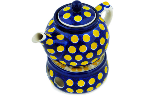 This Yellow Dots 15 oz Tea or Coffee Pot with Heater was handmade and hand decorated in Boleslawiec, Poland by skilled artisans according to old traditional methods. This Polish stoneware is microwave, dishwasher, freezer, and oven safe up to 480°F. It does not contain lead or cadmium. It is part of the Yellow Dots Collection.