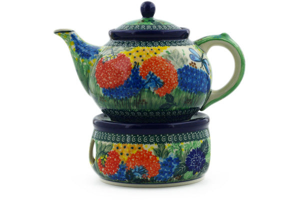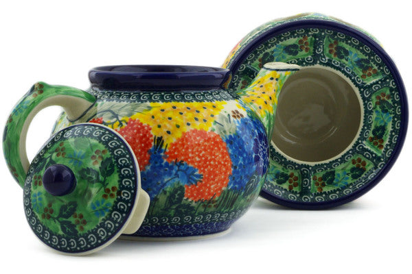 This Garden Delight 40 oz Tea or Coffee Pot with Heater was handmade and hand decorated in Boleslawiec, Poland by skilled artisans according to old traditional methods. This is a Polish pottery Signature Unikat, which means that it has been hand painted with both sponges and brushes and it is signed by the artist who painted it. Unikat pieces are the most intricate works of art. Larger Unikat items take hours of very careful work to finish. This Polish stoneware is microwave, dishwasher, freezer, and oven safe up to 480°F. It does not contain lead or cadmium. It is part of the Garden Delight Collection.