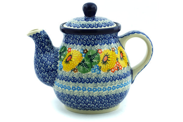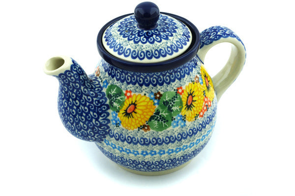 This Enchanted Spring 20 oz Tea or Coffee Pot was handmade and hand decorated in Boleslawiec, Poland by skilled artisans according to old traditional methods. This is a Polish pottery Signature Unikat, which means that it has been hand painted with both sponges and brushes and it is signed by the artist who painted it. Unikat pieces are the most intricate works of art. Larger Unikat items take hours of very careful work to finish. This Polish stoneware is microwave, dishwasher, freezer, and oven safe up to 480°F. It does not contain lead or cadmium. It is part of the Enchanted Spring Collection.