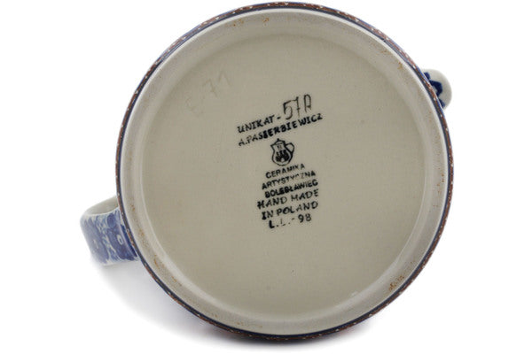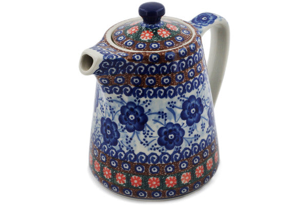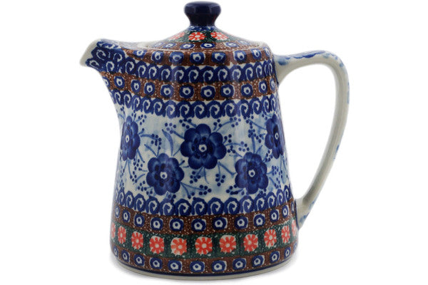 This Dancing Blue Poppies 37 oz Tea or Coffee Pot was handmade and hand decorated in Boleslawiec, Poland by skilled artisans according to old traditional methods. This is a Polish pottery Signature Unikat, which means that it has been hand painted with both sponges and brushes and it is signed by the artist who painted it. Unikat pieces are the most intricate works of art. Larger Unikat items take hours of very careful work to finish. This Polish stoneware is microwave, dishwasher, freezer, and oven safe up to 480°F. It does not contain lead or cadmium. It is part of the Dancing Blue Poppies Collection.