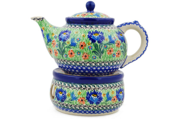 This Sprouting Cupids 40 oz Tea or Coffee Pot with Heater was handmade and hand decorated in Boleslawiec, Poland by skilled artisans according to old traditional methods. This is a Polish pottery Signature Unikat, which means that it has been hand painted with both sponges and brushes and it is signed by the artist who painted it. Unikat pieces are the most intricate works of art. Larger Unikat items take hours of very careful work to finish. This Polish stoneware is microwave, dishwasher, freezer, and oven safe up to 480°F. It does not contain lead or cadmium. It is part of the Sprouting Cupids Collection.