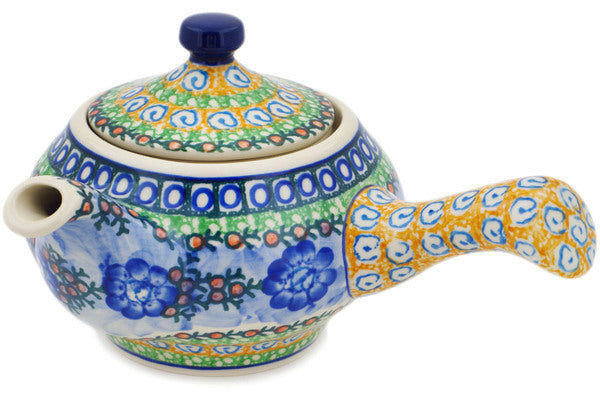 This Blue Poppy Circle 15 oz Tea Pot with Sifter was handmade and hand decorated in Boleslawiec, Poland by skilled artisans according to old traditional methods. This is a Polish pottery Signature Unikat, which means that it has been hand painted with both sponges and brushes and it is signed by the artist who painted it. Unikat pieces are the most intricate works of art. Larger Unikat items take hours of very careful work to finish. This Polish stoneware is microwave, dishwasher, freezer, and oven safe up to 480°F. It does not contain lead or cadmium. It is part of the Blue Poppy Circle Collection.