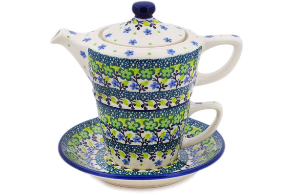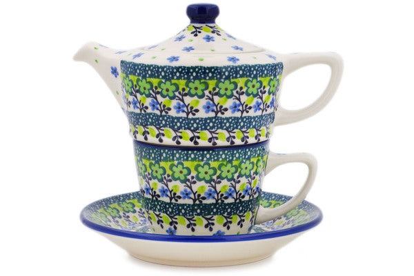 This Green Chrysanthemums 13 oz Tea Set for One was handmade and hand decorated in Boleslawiec, Poland by skilled artisans according to old traditional methods. This is a Polish pottery Signature Unikat, which means that it has been hand painted with both sponges and brushes and it is signed by the artist who painted it. Unikat pieces are the most intricate works of art. Larger Unikat items take hours of very careful work to finish. This Polish stoneware is microwave, dishwasher, freezer, and oven safe up to 480°F. It does not contain lead or cadmium. It is part of the Green Chrysanthemums Collection.