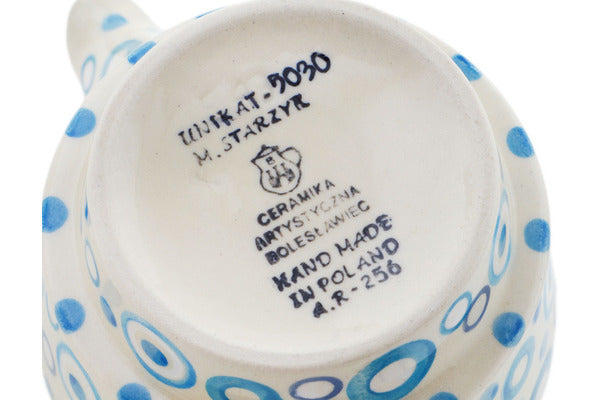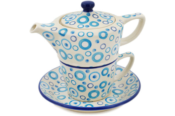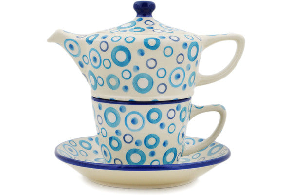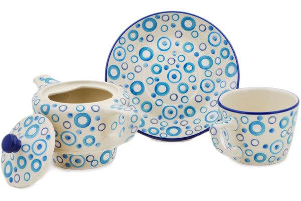 This Groovy Blues 13 oz Tea Set for One was handmade and hand decorated in Boleslawiec, Poland by skilled artisans according to old traditional methods. This is a Polish pottery Signature Unikat, which means that it has been hand painted with both sponges and brushes and it is signed by the artist who painted it. Unikat pieces are the most intricate works of art. Larger Unikat items take hours of very careful work to finish. This Polish stoneware is microwave, dishwasher, freezer, and oven safe up to 480°F. It does not contain lead or cadmium. It is part of the Groovy Blues Collection.