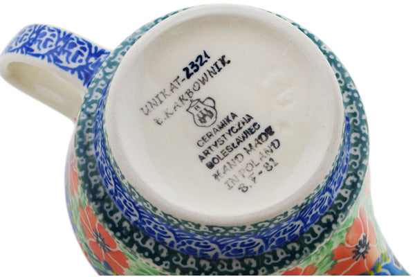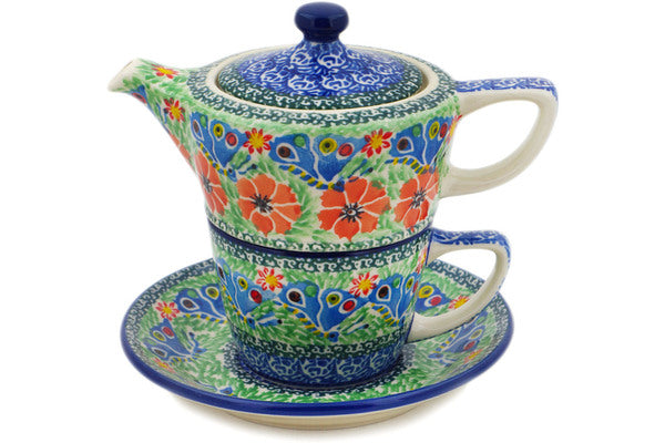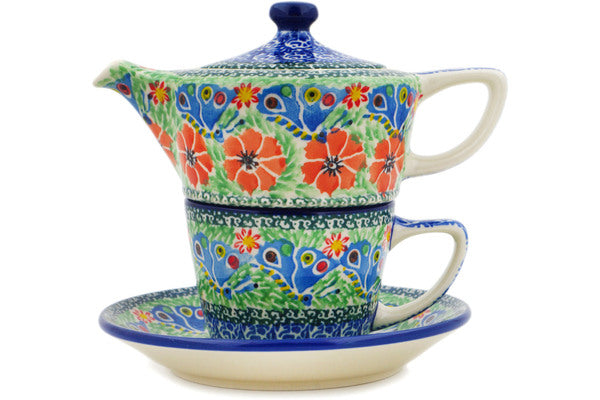 This Ring Of Flowers 13 oz Tea Set for One was handmade and hand decorated in Boleslawiec, Poland by skilled artisans according to old traditional methods. This is a Polish pottery Signature Unikat, which means that it has been hand painted with both sponges and brushes and it is signed by the artist who painted it. Unikat pieces are the most intricate works of art. Larger Unikat items take hours of very careful work to finish. This Polish stoneware is microwave, dishwasher, freezer, and oven safe up to 480°F. It does not contain lead or cadmium. It is part of the Ring Of Flowers Collection.