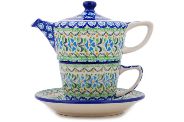 This Top Of The Morning 13 oz Tea Set for One was handmade and hand decorated in Boleslawiec, Poland by skilled artisans according to old traditional methods. This is a Polish pottery Signature Unikat, which means that it has been hand painted with both sponges and brushes and it is signed by the artist who painted it. Unikat pieces are the most intricate works of art. Larger Unikat items take hours of very careful work to finish. This Polish stoneware is microwave, dishwasher, freezer, and oven safe up to 480°F. It does not contain lead or cadmium. It is part of the Top Of The Morning Collection.