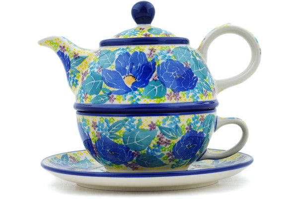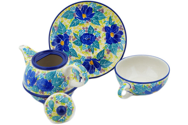 This Jovial 22 oz Tea Set for One was handmade and hand decorated in Boleslawiec, Poland by skilled artisans according to old traditional methods. This is a Polish pottery Signature Unikat, which means that it has been hand painted with both sponges and brushes and it is signed by the artist who painted it. Unikat pieces are the most intricate works of art. Larger Unikat items take hours of very careful work to finish. This Polish stoneware is microwave, dishwasher, freezer, and oven safe up to 480°F. It does not contain lead or cadmium. It is part of the Jovial Collection.
