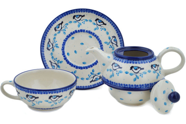 This Winter Sparrow 22 oz Tea Set for One was handmade and hand decorated in Boleslawiec, Poland by skilled artisans according to old traditional methods. This Polish stoneware is microwave, dishwasher, freezer, and oven safe up to 480°F. It does not contain lead or cadmium. It is part of the Winter Sparrow Collection.