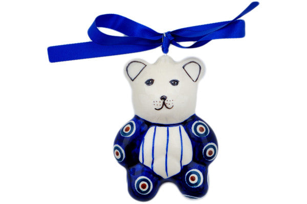 This Peacock 3" Teddy Bear Ornament was handmade and hand decorated in Boleslawiec, Poland by skilled artisans according to old traditional methods. This Polish stoneware is microwave, dishwasher, freezer, and oven safe up to 480°F. It does not contain lead or cadmium. It is part of the Peacock Collection.