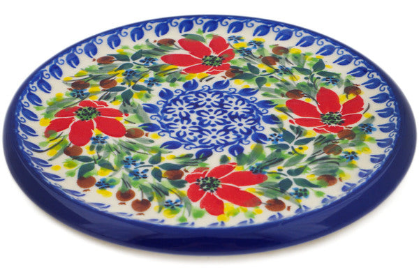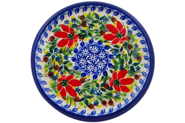 This Blooming Daisies 7" trivet, hot plate was handmade and hand decorated in Boleslawiec, Poland by skilled artisans according to old traditional methods. This is a Polish pottery Signature Unikat, which means that it has been hand painted with both sponges and brushes and it is signed by the artist who painted it. Unikat pieces are the most intricate works of art. Larger Unikat items take hours of very careful work to finish. This Polish stoneware is microwave, dishwasher, freezer, and oven safe up to 480°F. It does not contain lead or cadmium. It is part of the Blooming Daisies Collection.