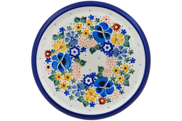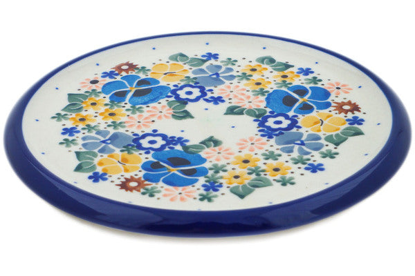 This Pansy Wreath 7" trivet, hot plate was handmade and hand decorated in Boleslawiec, Poland by skilled artisans according to old traditional methods. This is a Polish pottery Signature Unikat, which means that it has been hand painted with both sponges and brushes and it is signed by the artist who painted it. Unikat pieces are the most intricate works of art. Larger Unikat items take hours of very careful work to finish. This Polish stoneware is microwave, dishwasher, freezer, and oven safe up to 480°F. It does not contain lead or cadmium. It is part of the Pansy Wreath Collection.